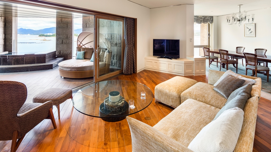 全室スイート。暖かい温泉に浸かりながら、田辺湾の潮の香りが頬を伝うとき、この一瞬が永遠に感じるほどに、愛おしく、美しく思う。 過去と未来を優しく包み込む柔らかな空間と時間。本当のご自身とご対面ください。 贅を尽くした空間、日常から切り離されるたった一つの場所。